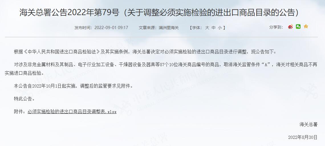 對涉及非危金屬材料及其制品、電子行業加工設備、干燥器設備及器具等87個10位海關商品編號的商品,取消海關監管條件“A”,海關對相關商品不再實施進口商品檢驗。