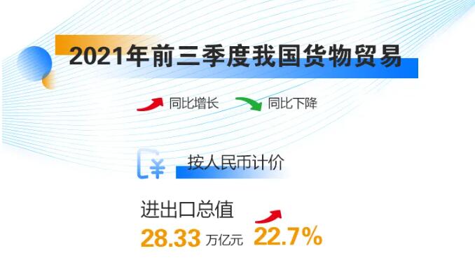 據(jù)海關(guān)統(tǒng)計(jì),前三季度,我國貨物貿(mào)易進(jìn)出口總值28.33萬億元人民幣,比去年同期增長(zhǎng)22.7%。