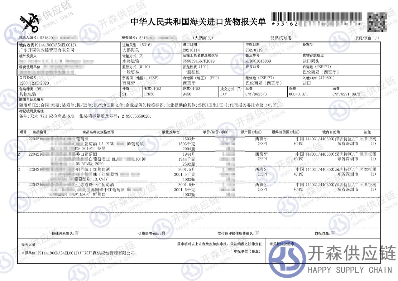 上述就是【進口案例】西班牙葡萄酒進口報關(guān)代理服務(wù)的全部內(nèi)容,希望能對您有所幫助,如有葡萄酒進口報關(guān)上任何疑問及問題可隨時在線聯(lián)系我們或撥打 18002611553,開森供應(yīng)鏈擁有豐富的葡萄酒進口報關(guān)操作經(jīng)驗及案例,10余年進口經(jīng)驗為您所用,各類進口疑難都能為您一一解答及協(xié)助快速處理解決!