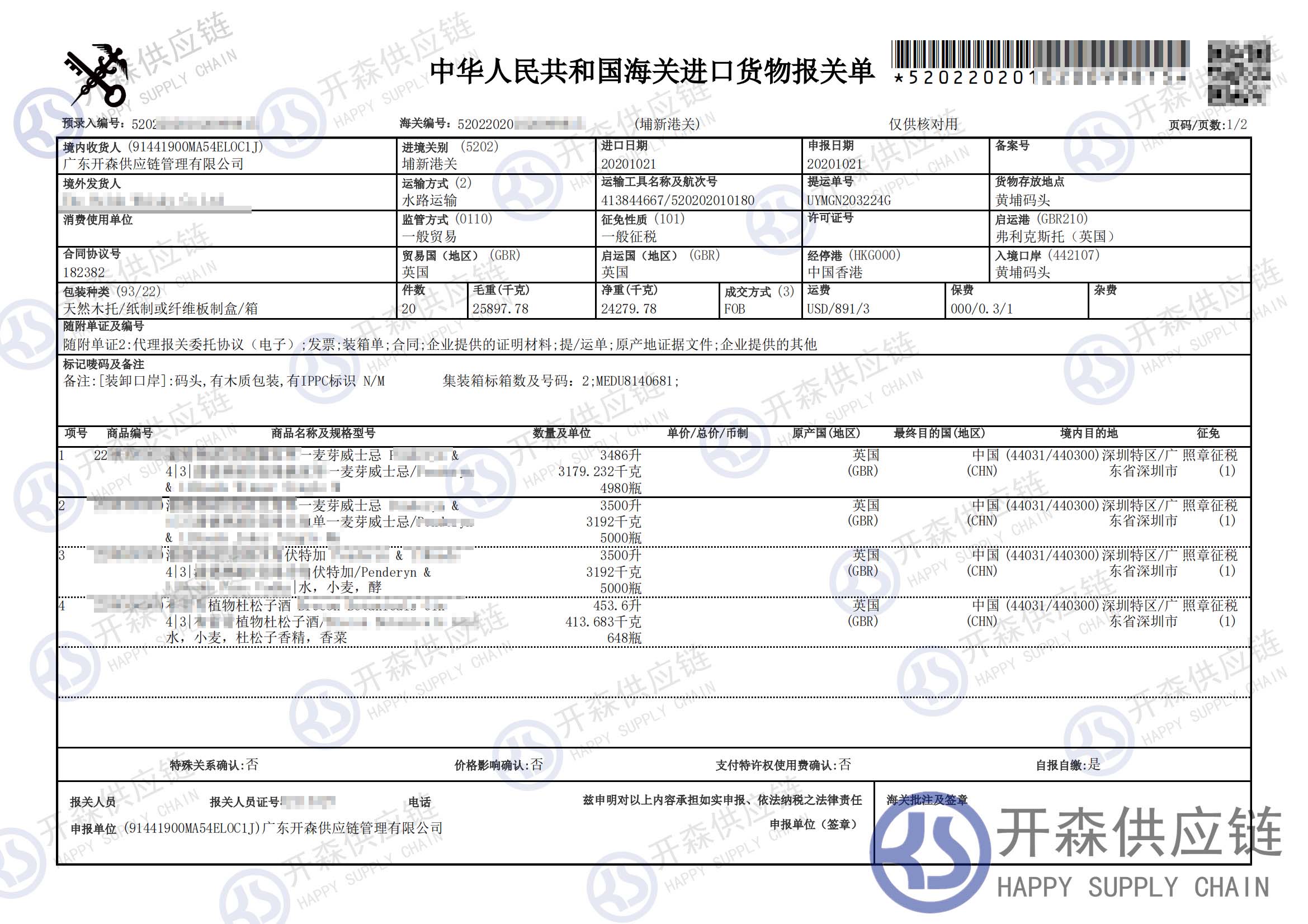 從英國威爾進口一批威士忌等酒到黃埔碼頭,我司提供門到門進口一站式清關服務,開森擁有十余年食品進口清關經驗及案例,為客戶提供量身制作的進口方案,讓客戶進口省時省心省成本。